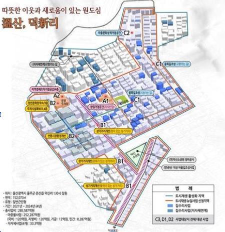 온산 덕신지역사업 산업단지 배후 이주민 거주 지역에 마을문화창작 거점공간, 창업플랫폼 조성 등을 통해 공동체와 일자리 재생이 핵심사업이다.