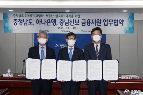 김용찬 행정부지사는 3일 도청 회의실에서 윤순기 하나은행 충청영업그룹 총괄대표, 유성준 충남신용보증재단 이사장과 ‘충청남도 3대 위기 극복을 위한 중소기업·소상공인 금융지원 업무협약’을 체결했다.