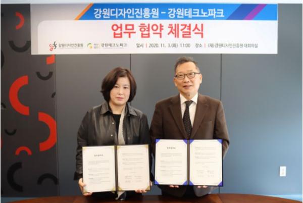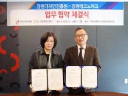 강원디자인진흥원과 강원테크노파크는 11월 3일 강원디자인진흥원 3층 대회의실에서 지역산업 디자인 경쟁력강화 및 중소기업 디자인개발 지원을 위한 업무협약을 체결했다.