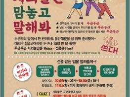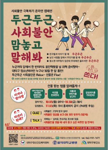 대전 대덕구정신건강복지센터(센터장 최경숙, 이하 센터)는 사회불안 관심군 청소년의 조기발견을 목적으로 10월 한 달 동안 진행한 사회불안 극복하기 온라인캠페인 ‘맘놓고 말해봐’를 성황리에 마쳤다고 4일 밝혔다.