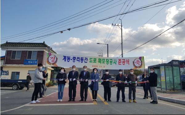 안성시는 지난 3일 김보라 안성시장, 신원주 안성시의회의장, 안정열 시의원, 반인숙 시의원, 오경운 안전도시국장 등 내외빈을 비롯한 지역주민 50여명이 참석한 가운데 ‘계동-중리동간 도로확포장공사’ 준공식을 가졌다.