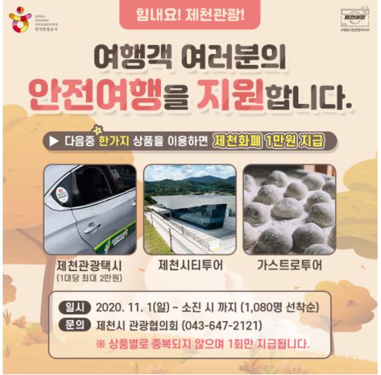 대상은 11월 1일부터 제천 시티투어, 관광택시, 가스트로투어 중 한 가지 이상의 관광상품을 이용한 관광객이다.