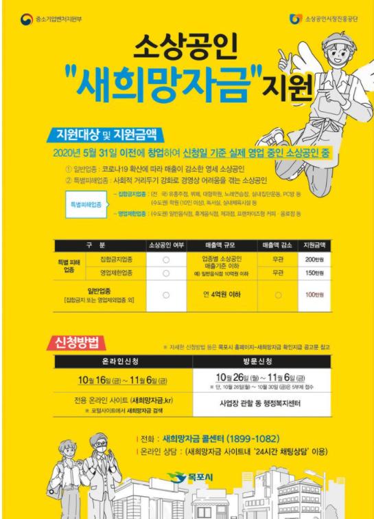 소상공인 새희망자금은 코로나19로 매출이 감소한 소상공인과 영업제한 또는 집합금지 등의 행정명령이 내려진 업종을 지원하기 위한 정부의 지원금으로 전년대비 매출감소 업소의 경우 100만원, 영업제한 조치 150만원, 집합금지 조치 200만원이 지원된다.