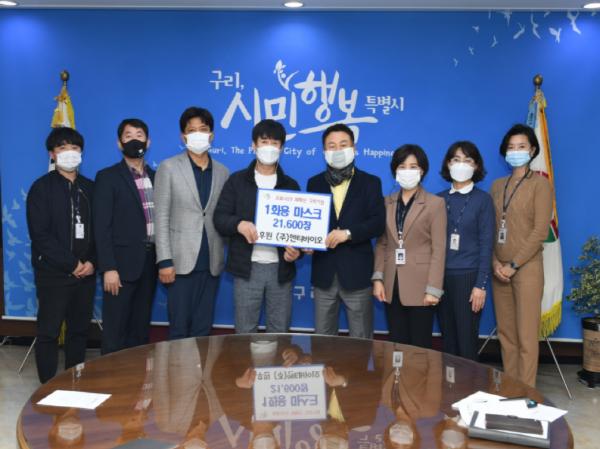 구리시는 지난 3일 시청 민원상담실에서 ㈜엔티바이오 이기준 대표 등 관계자 등이 참여한 가운데, 코로나19 확산 방지 일회용 마스크 21,600장을 전달받았다고 밝혔다.