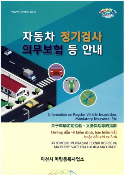 이천시는 관내에 거주하는 외국인 중 차량을 등록한 839명에게 자동차종합(정기)검사 및 의무보험 미가입 운행 예방을 위해 우리말 이외의 4개 언어로 번역된 정보(영어, 중국어, 베트남어, 우즈베크어)를 담은 홍보전단을 배부했다고 밝혔다.