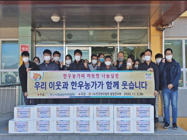 함양군은 3일 전국한우협회 함양군지부(지부장 노우현)에서 한우 먹는 날을 맞이하여 지역사회 어려운 이웃에게 나눔행사로 한우불고기 112kg(400만원 상당)의 후원 물품을 전달했다고 밝혔다.