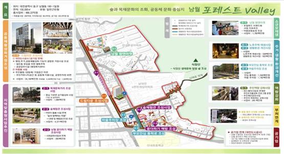 동구는 산내동 행정복지센터 일원(15만㎡)에 총 486억 원*을 투입해 ▲ 대전드림타운(행복주택) ▲ 목재 문화거리 조성 ▲ 숲체험관 ▲ 노후주택 정비 등을 추진해 청년?신혼부부 인구 유입과 지역특화 자원인 식장산과 연계한 관광상품 개발 등 지역에 활력을 불어넣을 계획이다.