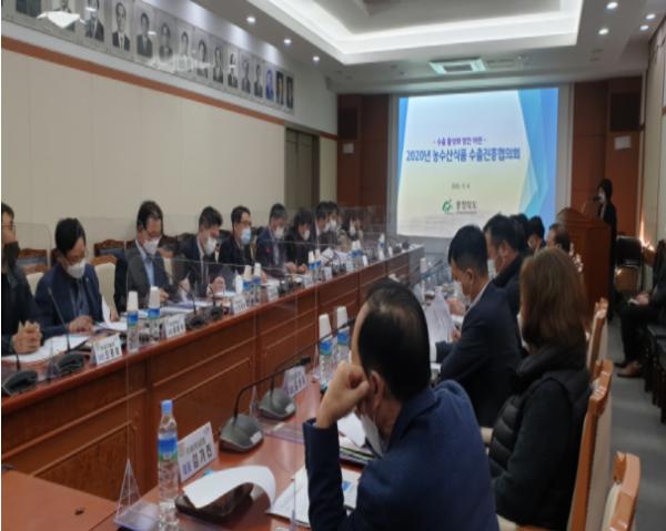 충북도는 4일 도청 소회의실에서 도내 농수산식품 관련 기업인, 유관기관, 수출전략 전문가 등이 참석한 가운데 「2020년 충북 농수산식품 수출진흥협의회」를 개최하였다.