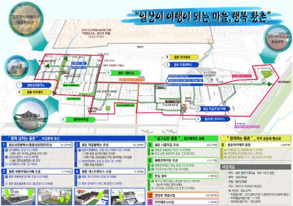 시는 지난 7월 경주역 동편 일대 구도심지역을 ‘일상이 여행이 되는 마을, 행복 황촌’이란 사업명으로 도시재생뉴딜사업 공모 신청했으며, 국토부 및 LH(한국토지주택공사) 와의 사전 컨설팅과 평가단의 현장실사·발표 평가, 실행가능성 및 타당성 평가 등을 거쳐 도시재생특별위원회에서 뉴딜사업 대상지로 최종 선정이 됐다.
