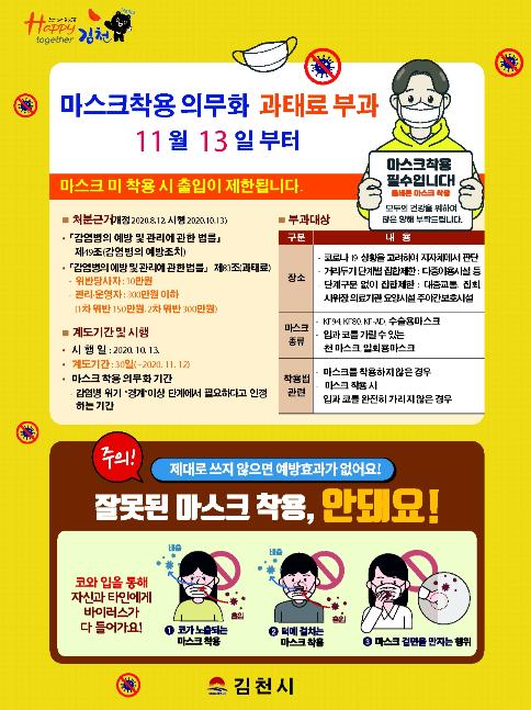 김천시는 감염병예방 및 관리에 관한 법률이 개정됨에 따라 코로나19 예방 및 확산 차단을 위해 감염병 전파의 위험성이 있는 장소 또는 시설의 관리자ㆍ운영자ㆍ이용자 등에 대하여 ‘마스크 착용 의무화’ 행정명령을 발령했다.