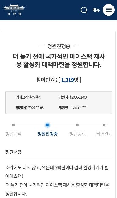 청원 글에서 조 시장은 “최근 코로나로 인해 비대면 소비가 늘면서 아이스팩 사용량이 3억2천여 개로 추정되는 등 기하급수적으로 늘고 있으며, 아이스팩은 매립 시 자연분해에 500년이 소요되고, 불에 타지 않아 소각도 불가능하다”며, “주성분인 고흡수성수지는 미세플라스틱의 일종으로 하수 배출 시 심각한 수질오염을 일으켜 향후 환경위기로 되돌아 올 것”이라고 설명했다.