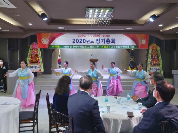 고성군지부는 식전행사로 이날 회원으로 구성된 한국무용팀의 민요춤(노들강변), 소고춤과 오카리나 연주 및 전국가야국약대전에서 장려상을 수상한 고고장구공연단 공연으로 더욱 분위기가 고조됐다. 한편, 지부발전에 공이 큰 국악분야 대한민국 최고의상인 ▲(사)한국국악협회 이사장 표창에 이용재, 이쌍자 이사 ▲국악도지회장표창 이재준이사가 각각 받았다.▲2019년도 주요추진사업실적보고 ▲2019년도 세입,세출 결산(안) 승인과 올하반기 추진 사업으로 ▲제4회 고성국악제 우리소리한마당 큰잔치 ▲제4회 찾아가는 읍,면 국악한마당 ▲회원 국악기행 등 올하반기 마무리키로 결의했다.