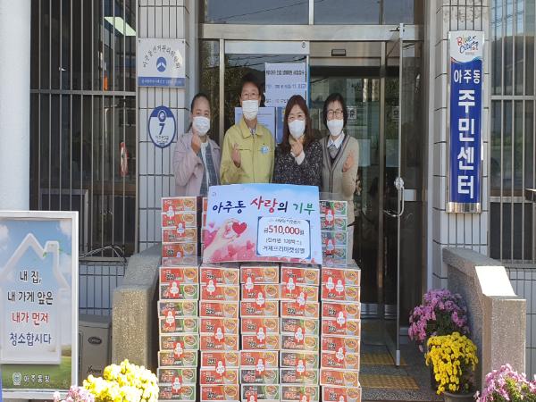 이번 기탁은 아주서당골천 빛 축제 & 가을 음악회 수익금의 일부로 마련한 성품으로 아주동 관내 코로나19와 조선 경기 불황으로 위기를 겪고 있는 30가구에 전달될 예정이다.