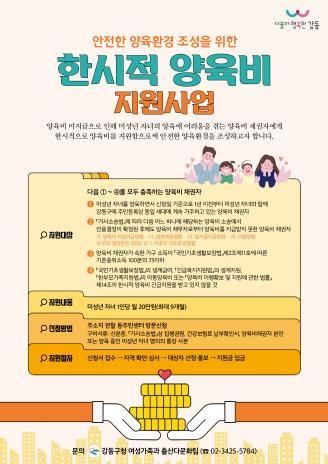 이정훈 강동구청장은 “한시적 양육비 지원을 통해 자녀양육과 생활에 어려움을 겪고 있는 한부모 가정에 조금이나마 도움이 되길 바란다”고 전했다.