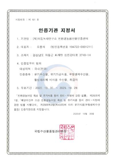 재)하동녹차연구소 친환경인증센터가 2011년 친환경농산물 인증기관 지정에 이어 국내 최초로 친환경수산물 인증기관으로 지정됐다.