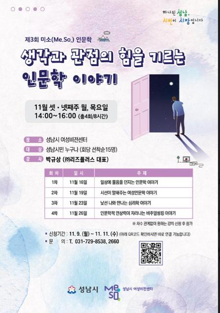 성남시는 여성비전센터 유튜브 채널을 통해 ‘제3회 미소(Me.So,) 인문학 강좌’인 ‘생각과 관점의 힘을 기르는 인문학 이야기’ 프로그램을 운영한다.