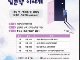 11월 셋, 넷째 주 월, 목요일 오후 2시부터 2시간 동안 진행되는 이번 강좌는 16일 월요일 ‘일상에 물음을 던지는 인문학’을 시작으로, 19일 ‘시선이 말해주는 여성인문학’, 23일 ‘낯선 나와 만나는 심리학’, 26일 ‘인문학적 연상력이 자라나는 비주얼씽킹’을 이야기 한다.