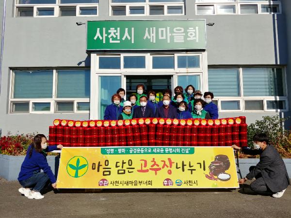 사천시새마을부녀회는 11월 4일 사천시새마을회관에서 전 읍면동 부녀회장들이 참여한 가운데 고추장 500통(1.6㎏)을 담아서 ‘마음 담은 고추장 나누기’행사를 개최하였다.