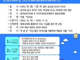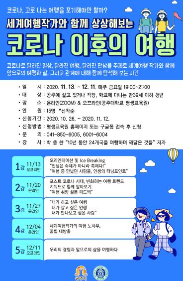 공주시가 오는 13일 개강하는 공주시민대학 특별과정 ‘세계여행 작가와 함께 상상해보는 코로나 이후의 여행’ 수강생을 모집한다.