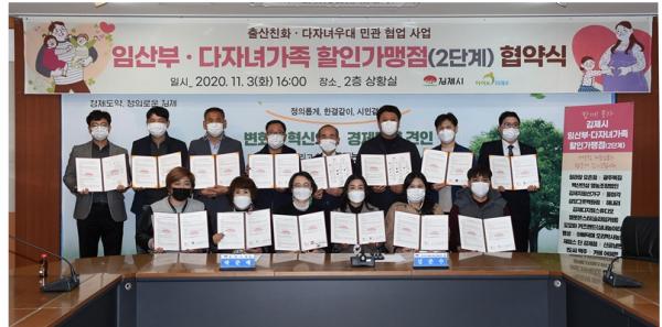 김제시는 11월 3일 김제시청 2층 상황실에서 지역의 19개 소상공인 업소가 2단계 임산부·다자녀 가족 할인점으로 추가 동참해 협약을 체결했다고 3일 밝혔다.