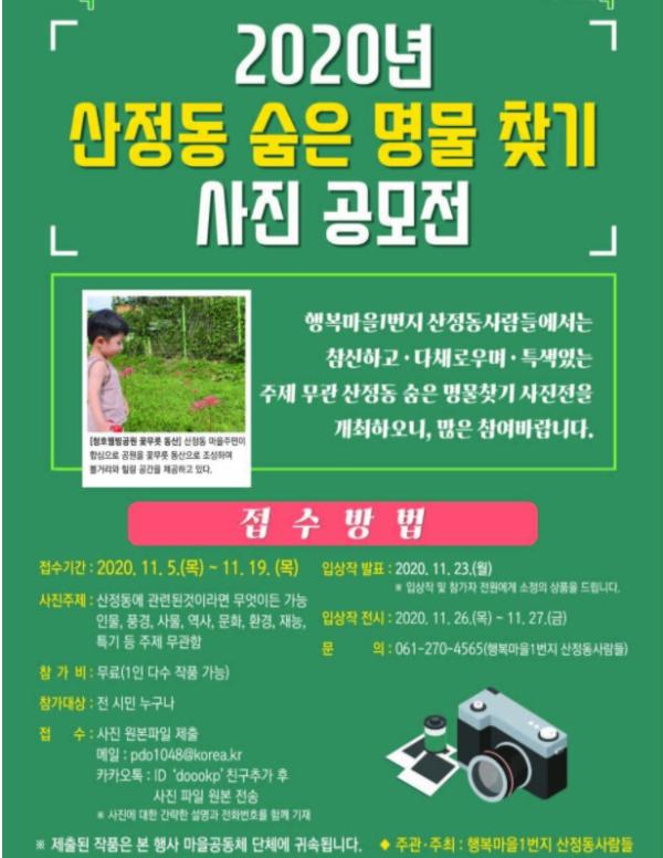 공모전에 대한 자세한 사항은 행복마을1번지 산정동사람들(061-270-4565)로 문의하면 된다.