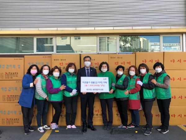 김봉조 북부동장은 “지역의 어려운 이웃을 위해 지속적인 따뜻한 나눔 활동을 실천해주시는 새마을 부녀회장님과 회원들께 깊은 감사를 드리며, 지역주민이 나서서 서로 돕고 어려움을 함께 극복하는 명품 북부동을 만들기 위해 더욱 더 노력하겠다.”고 밝혔다.