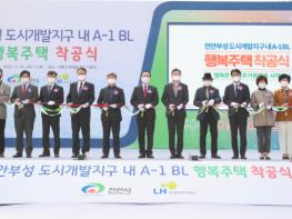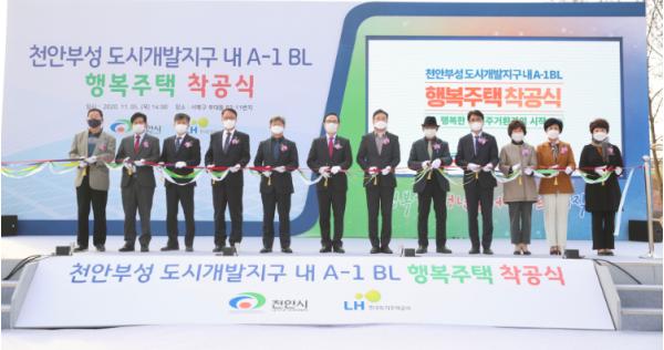 시는 5일 오후 천안부성도시개발지구 내 사업부지에서 박상돈 시장을 비롯한 LH관계자, 국회의원, 시의원, 주민대표 등 내빈이 참석한 가운데 부성지구 행복주택 건설공사 착공식을 열었다.