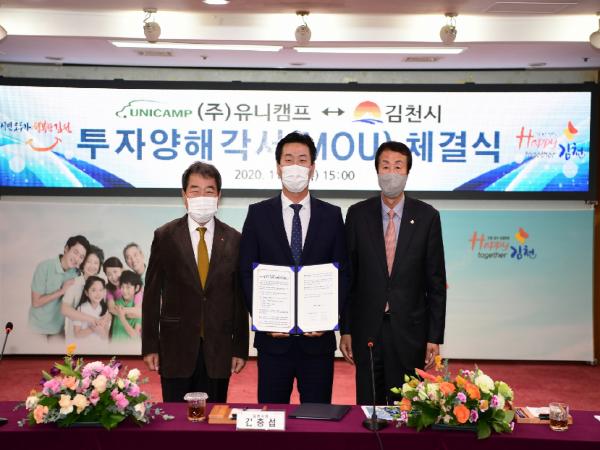 김천시는 5일 오후 3시 김천시청 회의실에서 김충섭 김천시장, 이우청 시의회 의장, ㈜유니캠프 오완곤 대표 등 20여명이 참석한 가운데 캠핑용 특장차 생산를 위한 투자양해각서를 체결했다.