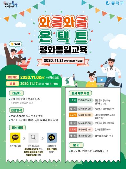 카카오톡 채널 ‘동작평화통일교육’ 또는 ‘동작구 와글와글 온택트 평화통일교육’을 통해 신청가능하며 오는 17일(화)에 개별 통보한다.