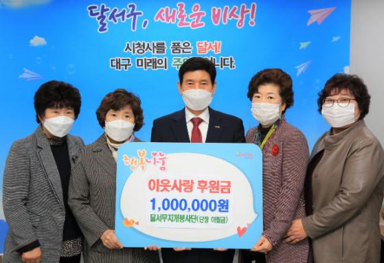 대구 달서구는 달서무지개봉사단에서 지난 3일 구청장실에서 연말을 맞아 동절기 저소득취약계층을 지원해 달라며 이웃사랑 후원금 100만원을 기탁했다고 밝혔다.