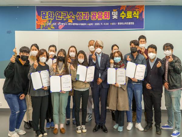 이번 성과공유회 및 수료식에는 문화연구소에 참여한 네 팀이 ‘통제영 옛 성터를 배경으로 한 온택트 컨텐츠 제작’, ‘항남동 오행당골목 유휴공간 전시’, ‘중앙동 골목길 포토존 만들기’ 등 각자의 활동에 대한 성과를 발표하고 문화연구소 참여자 14명에게 수료증을 수여했다.