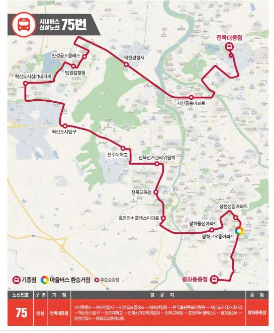 이와 함께 시는 75번 노선을 신설해 운행한다. 75번 버스는 전북대~서신동~만성지구~혁신도시~전주대~신시가지~효천지구~삼천동~평화동을 다니게 된다. 시는 75번 노선 신설로 대규모 아파트 단지에 거주 중인 시민들의 교통편의가 한층 높아질 것으로 보고 있다.