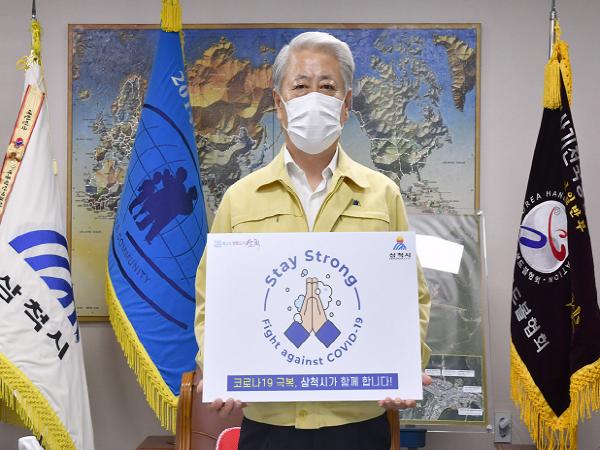 김양호 삼척시장은 ‘Stay Strong- 코로나19 극복, 삼척시가 함께 합니다.’란 슬로건이 적힌 팻말을 들고 캠페인에 나섰다.