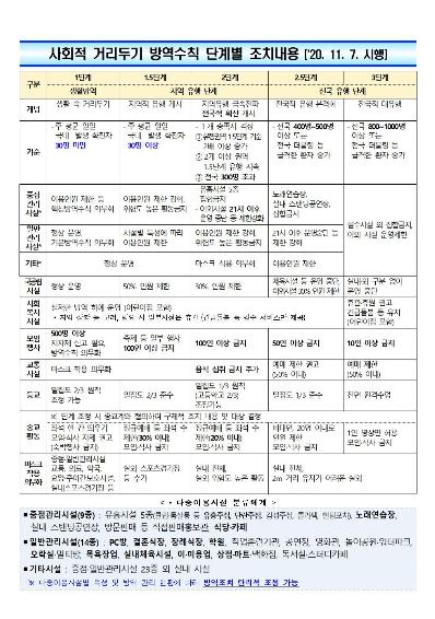 중앙재난안전대책본부에서는 다중이용시설 분류체계를 기존 고-중-저위험 3층 구조에서 중점관리시설과 일반관리시설의 2층구조로 재정비하여 시행한다. 중점 관리시설은 클럽 등 유흥시설, 노래연습장, 식당·카페 등 9종이며, 일반관리시설은 PC방, 학원, 목욕탕, 상점 등 14종이다.