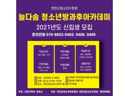 연천군 청소년육성재단에서는 관내 초등학생 4~6학년을 대상으로 ‘2021년도 늘다솜 청소년방과후아카데미’신입생을 모집한다고 밝혔다.