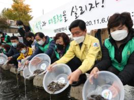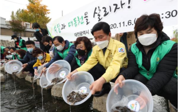 대전시 동구는 6일 대동천에서 하천 생태계 보호 운동 일환으로 대동천 미꾸라지 방류행사를 가졌다.