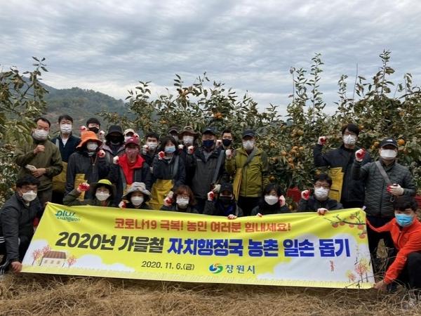 창원시 자치행정국직원 30여명은 6일 가을철 농번기에 코로나19 사태로 일손 부족으로 어려움을 겪고 있는 의창구 동읍 단감 재배 농가를 찾아가 일손 돕기에 나섰다.