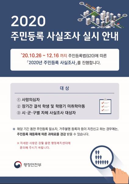 주민등록 사실조사는 매년 전세대를 조사하여 무단전출자, 허위신고자는 최고·공고 등의 절차를 거쳐 직권조치하고, 말소·거주불명등록 된 자는 재등록하도록 유도해 주민등록사항과 실제 거주사실을 일치시켜 효율적 행정 및 주민생활의 편익을 증진시키기 위해 실시하고 있다.