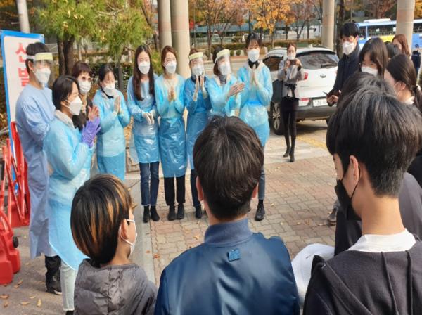 “1학기, 저희 학교에 방역도 해주시고 소독도 해주셨다고 들었습니다. 저는 홀수 번호라서 검사를 받지 않았지만 너무너무 감사드립니다. 우리 대한민국이 방역국가로 알려진 건 다 보건소 분들, 의료진분들 덕분입니다. 무더운 날씨에도 방호복에 고글까지 쓰시며 일하시는 모습을 보니 존경스럽습니다. 저는 이런 보건소 분들을 둔 대한민국 국민인 게 자랑스럽습니다. 몸 건강하시고 파이팅!”