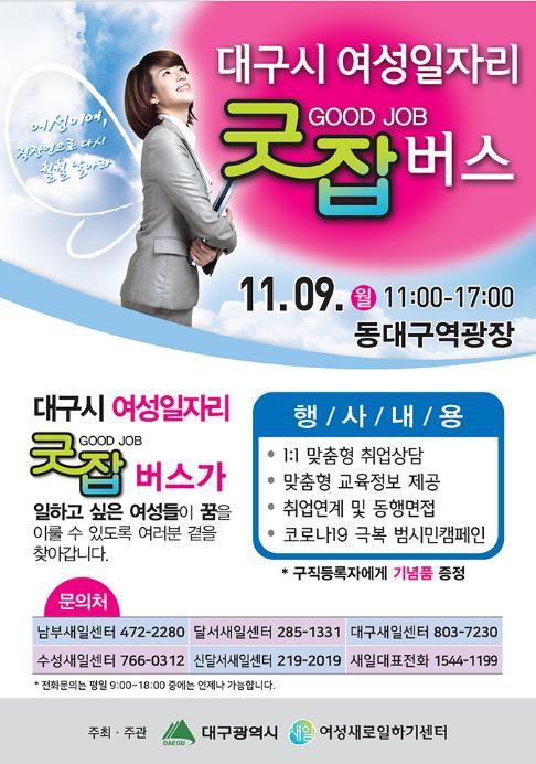 금년도 굿잡 버스는 6월에 동성로 야외무대에서 첫 출발하여, 11.9.(월) 마지막 도착지인 동대구역 광장에서 개최되며, 이번 행사는 지역 5개 여성새로일하기센터(이하 새일센터)가 공동 참여하여 11시~17시까지 진행된다.