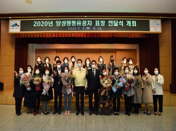 남구는 11월 5일 구청 대강당에서 양성평등 사회 실현 촉진을 위해 노력한 유공자를 격려하고 감사의 마음을 전하는 ‘2020년 양성평등유공자 표창 전달식’을 개최했다.