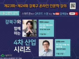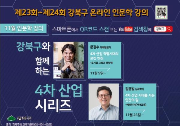 강북구가 ‘강북구와 함께 하는 4차 산업 시리즈’ 인문학 강의를 온라인으로 개최한다. 시리즈는 두 개의 프로그램으로 구성되어 있으며 강북구 공식 유튜브 채널을 통해 9일(월)과 23일(월) 선보인다.