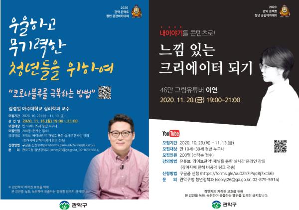 관악구가 오는 16일과 20일, 유튜브 라이브 관악을 통해 진행하는 ‘온택트 청년 공감 아카데미’ 참여자를 모집한다고 밝혔다.