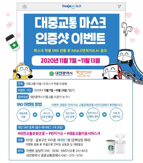 대중교통 이용 시 마스크를 착용한 인증샷을 소셜네트워크서비스(SNS)에 올리고 교통문화 홈페이지(http://먼저가슈.kr)에 참여 신청하면 추첨을 통해 101명에게 경품을 지급하는 온라인 이벤트가 13일까지 진행된다.