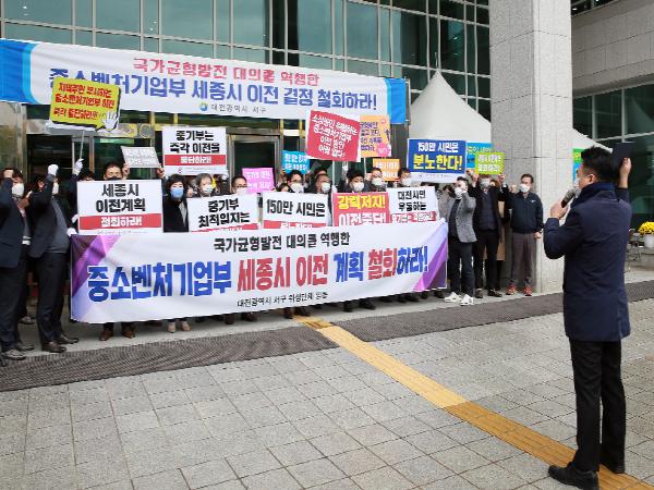 이날 성명을 발표한 김용기 외식업중앙회 대전시지회장은 “명분 없는 중기부 세종시 이전 계획은, 코로나19로 어려움을 겪고 있는 우리 지역 소상공인과, 혁신 도시 지정으로 한껏 기대에 부푼 150만 대전시민에게 큰 실망감을 안겨주는 처사로 이전 계획 철회만이 유일한 대안이다”라고 말했다.