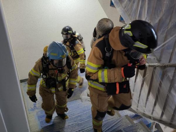 이날 훈련은 팀별 4명을 구성해 ▲37층 계단오르기 ▲소방시설을 활용한 화재진압 ▲인명탐색 순으로 진행됐다.