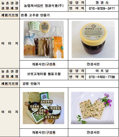 이번 사업에는 농촌체험휴양마을, 농촌융복합산업인증업체, 교육농장, 낙농체험목장 등 279개소의 농촌관광경영체가 참여하며, 체험키트는 전통 고추장 만들기, 강정 만들기, 반려식물 키우기, 과일·허브를 이용한 천연비누 만들기, 압화 이용 생활용품 만들기 등 지역 농특산물을 활용한 다양한 제품(507개)으로 구성되어 있다.
