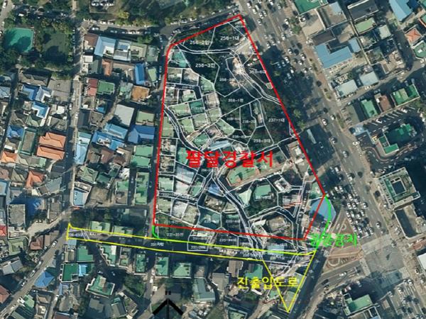 수원팔달경찰서 주변 기반 시설 조성 사업은 공공공지 조성과 ‘도로 개설’로 진행된다. 진입도로 조성사업은 팔달경찰서 정문과 경수대로를 연결하는 기존 도로를 확장하고, 못골사거리 일원 교통체계를 개선하는 것이다. 현재 손실보상 협의를 진행 중이다.