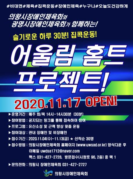의왕시장애인체육회는 코로나19로 지친 일상에서‘이제 핸드폰으로 어디서든 실시간으로 함께 운동하자!’는 슬로건을 가진 하루 30분 비대면 화상수업인‘어울림 홈트 프로젝트’를 오는 17일부터 시작한다고 밝혔다.
