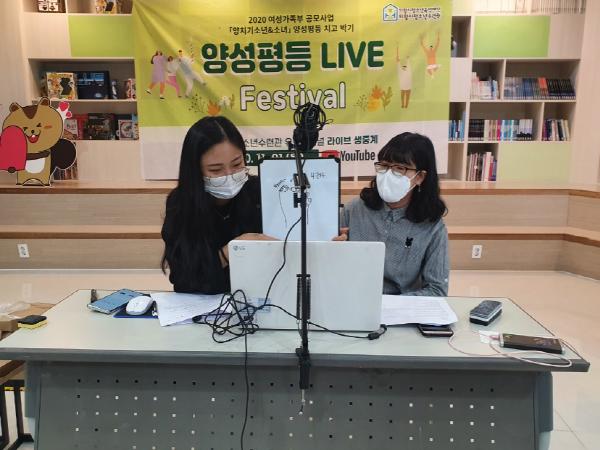 양성평등 라이브 축제를 기획하고 진행했던 이유정 단원은 “그동안 양성평등이라는 큰 주제로 다양한 활동을 진행했고, 그 활동들을 최종 마무리하는 양성평등 라이브 축제를 기획하고 진행했는데, 생중계로 진행하다보니 부담이 많이 되었지만, 댓글을 통해서 청소년들과 소통하며 양성평등에 대한 이해의 폭을 넓히는 좋은 계기가 되었다.”고 말했다.